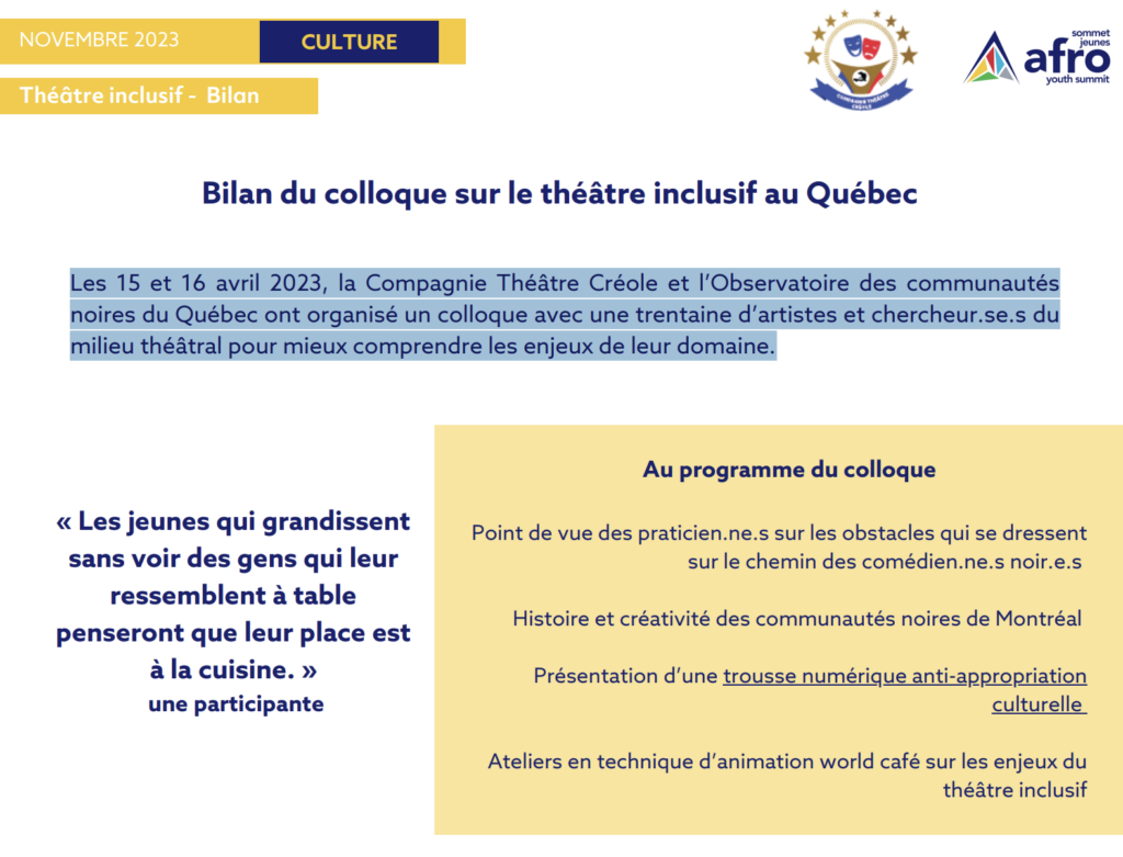Les 15 et 16 avril 2023, la Compagnie Théâtre Créole et l’Observatoire des communautés noires du Québec ont organisé un